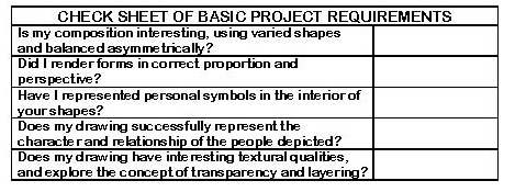 Assignment: Design a composition using the silhouette of yourself with another person(s) significant in your life. Integrate symbols that are meaningful to you within the confines of the figures. Shade with value gradations around the shape to fill the negative space. Develop your negative space further with textural marks, using rubbings.